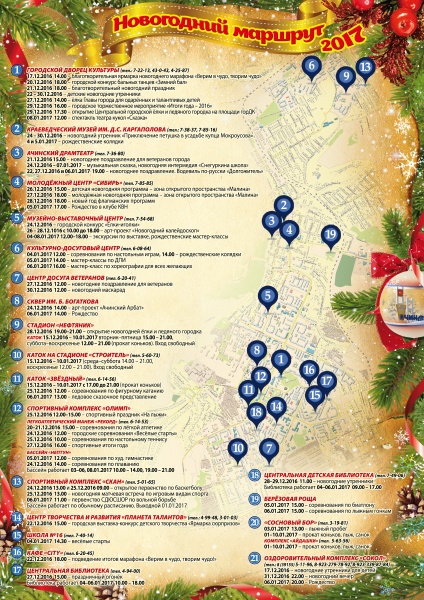 Специалистами отдела культуры администрации города Ачинска разработана дорожная памятка по праздничным новогодним событиям. В маршруте 21 остановка и более 60 крупных городских мероприятий, рассчитанных на период с 15 декабря 2016 года и до 9 января 2017 года.