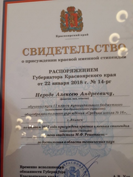 Сегодня, 27 февраля, заместитель председателя правительства Красноярского края Алексей Подкорытов вручил учащимся образовательных организаций Красноярского края свидетельства о присуждении краевых именных стипендий по итогам 2017 года. Свидетельства из его рук получили 35 одаренных ребят, в их числе школьник из Ачинска Алексей Нероде.
