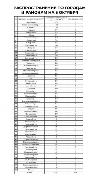 В Красноярском крае выявили еще 120 больных коронавирусом. Общее число составило 20 587 случаев. Выздоровевших 14 человек, умерли 2, за всё время — 561 человек.
