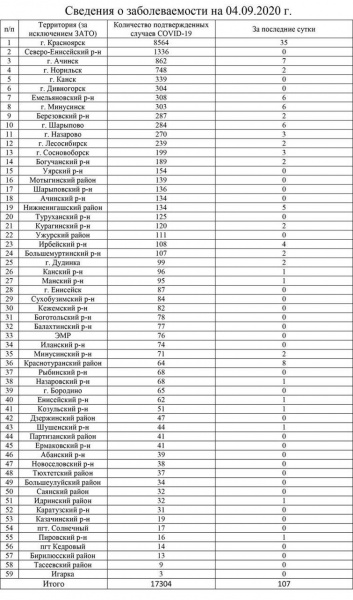 В Роспотребнадзоре Красноярского края публикуют данные по новым случаям заражения коронавирусом за последние сутки, 3 сентября. Данные актуальны на 14:00 текущего дня.