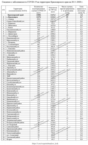 В Красноярском крае число заболевших коронавирусом за сутки увеличилось на 531 человека, из которых 336 — по официальной сводке, рекордные 127 — в Железногорске и 68 — в Зеленогорске. Общее число заболевших составило 37 912 за всё время пандемии.