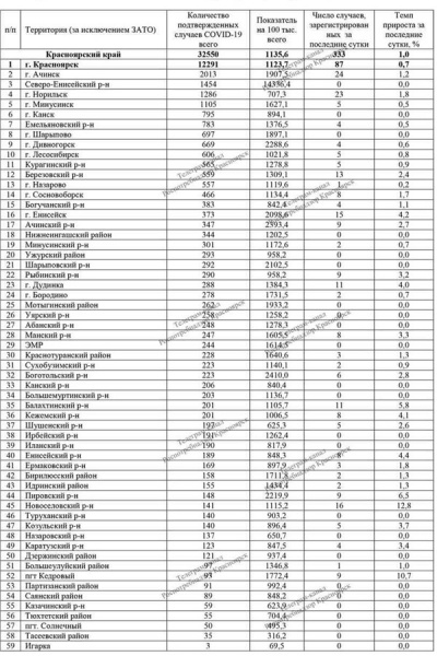 Сегодня, 19 ноября, количество больных в крае достигло 32 550 (+333 за сутки). Темп прироста за стуки по-прежнему составляет 1,1 %. В Красноярске за сутки Covid-19 заболели 87 человек.