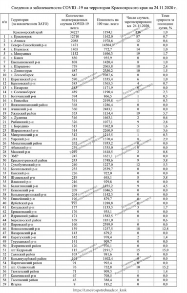 Сегодня Красноярский край преодолел планку в 34 тысячи заболевших коронавирусом. На 14 часов 24 ноября в регионе зарегистрировано 34 227 подтвержденных случаев коронавирусной инфекции (+336 за сутки, что на 1 больше, чем накануне). В числе новых заразившихся 87 красноярца (на 3 больше, чем в понедельник).