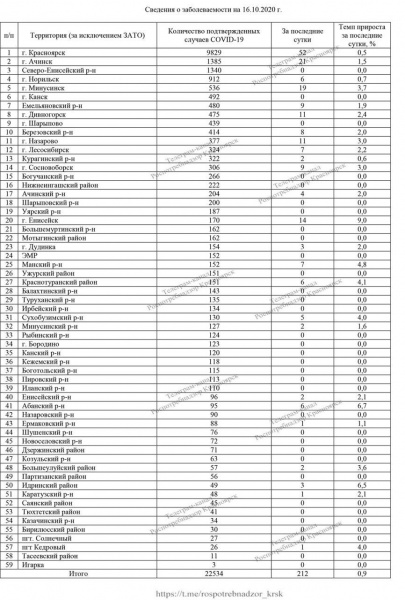 Распространение вируса идет во всех муниципалитетах. Активнее всего в Красноярске — 52 случая за сутки и в Ачинске — 21.