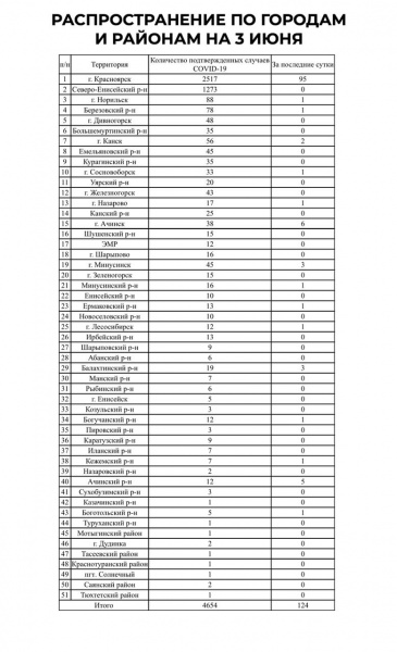 На 14.00 часов 03.06.2020 г. в Красноярском крае зарегистрировано всего 4654 лабораторно подтвержденных случая заболевания COVID-19 на 51 территории края, в том числе за последние сутки зарегистрировано 124 случая заболевания.