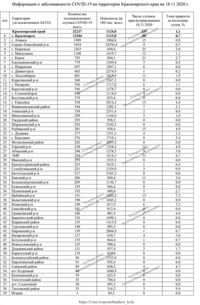 Роспотребнадзор Красноярского края публикует данные за минувшие сутки по новым случаям заражения коронавирусом. В регионе выявлено 335 больных. К этой цифре можно прибавить закрытые города: в Железногорске выявлено 83 случая, в Зеленогорске — 22. Получается, всего за 18 ноября диагноз поставлен 440 людям.