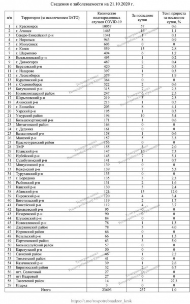 Роспотребнадзор Красноярского края публикует последние данные по числу заразившихся новой коронавирусной инфекцией на 21 октября. По данным ведомства, за все это время диагноз поставлен 23 696 людям. За сутки их стало больше на 237.