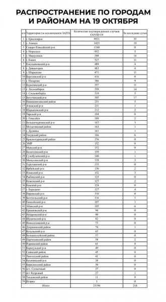В Красноярском крае на 19 октября коронавирусом заболело 218 человек