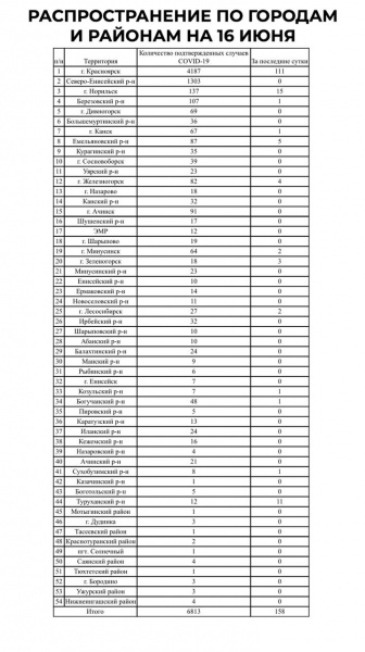 В Красноярском крае еще 158 человек заразились коронавирусом за последние сутки. Таким образом, общее число в регионе выросло до 6813 человек от начала пандемии.