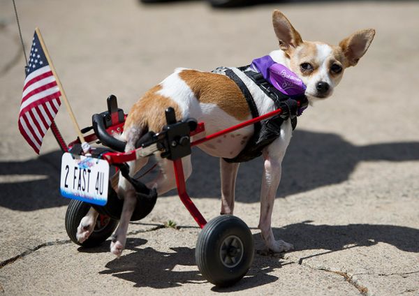 Этот чихуахуа стал участником ежегодного забега среди представителей своей породы. Примечательно, что наличие инвалидной тележки не помешало псу соревноваться наравне со своими здоровыми сородичами.
