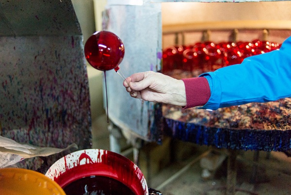 Следующий этап производства — металлизация. В специальных вакуумных камерах игрушки покрывают тонким слоем алюминия, что делает их поверхность зеркальной. После металлизации игрушки красят. Разумеется, тоже вручную.
