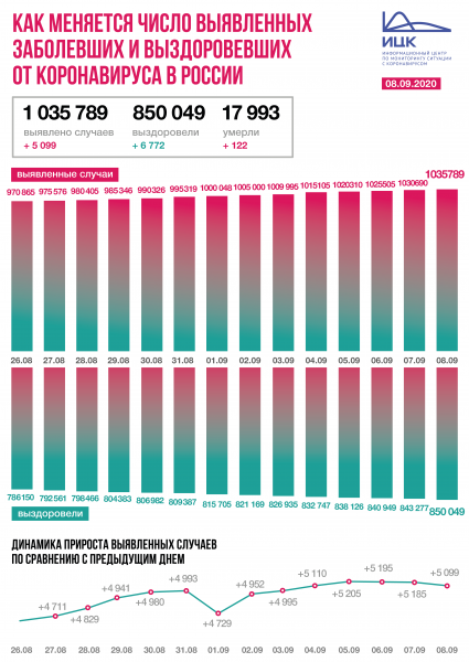 Всего на сегодняшний день зарегистрировано 1 035 789 случаев (+0,5%) коронавирусной инфекции в 85 регионах. За весь период зафиксировано 17 993 летальный исхода, выздоровели 850 049.
