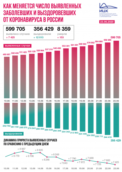 Всего на сегодняшний день зарегистрировано зарегистрировано599705случаев (+1,3%)коронавирусной инфекции в 85 регионах. За весь период зафиксировано 8 359 летальных исходов, выздоровели 356 429человек.