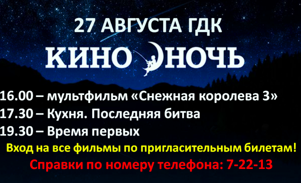 27 августа 2017 года в культурно-досуговых учреждениях Ачинска пройдет ряд мероприятий, посвященных всероссийской акции «Ночь кино-2017».