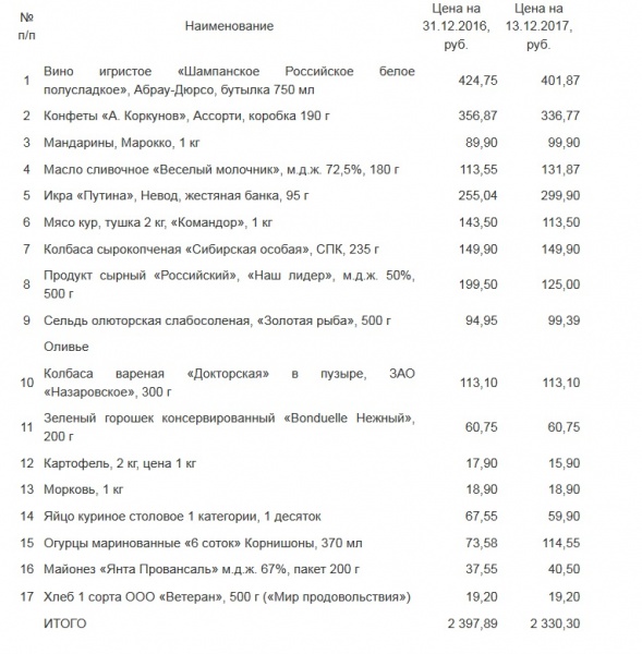 В перечень вошло 17 продуктов, которые обычно используют ачинцы для приготовления новогодних блюд. Отметим, экономисты отслеживают стоимость продукции определенной марки в одних и тех же торговых точках.
