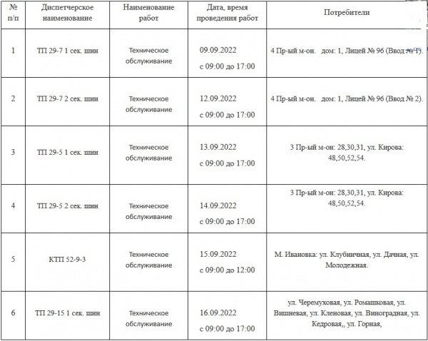 На основании уведомления западного филиала АО «КрасЭКо» информируем жителей Ачинска о проведении работ по техническому обслуживанию электрооборудования и ограничении подачи электроэнергии с 9 по 16 сентября.