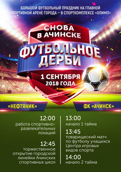 В субботу, 1 сентября, в 12:00 состоится большой спортивный праздник - «Футбольное дерби». На главном поле спортивного комплекса «Олимп» встретятся две сильнейшие команды Красноярского края, выступающие в высшей региональной: ФК «Ачинск» и «Нефтяник».