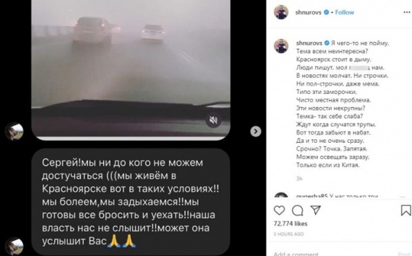 Лидер группировки «Ленинград» и рок-музыкант Сергей Шнуров написал стихи о черном небе в Красноярске. Сделал он это после того, как к нему в личные сообщения в Instagram красноярцы начали писать о проблеме. И, судя по стихотворению, решил, что это несправедливо, когда освещаются проблемы других стран на федеральных каналах, а про Красноярск молчат.