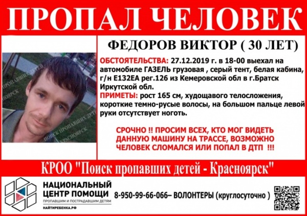 27 декабря в 18:00 он выехал на грузовой «Газели» в Братск из Кемеровской области через Красноярск и пропал. С тех пор родные ничего о нем не слышали.
