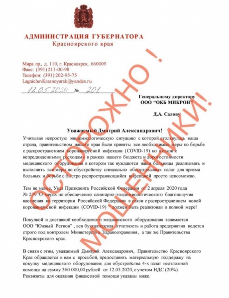 Мошенники, которые наживаются на пандемии, переключились с обычных людей на крупный бизнес. Они рассылают руководителям предприятий письма от имени правительства региона и краевого Минздрава с просьбой дать денег на нужды больниц. В письмах жалуются, что в бюджете не хватает средств, чтобы оборудовать больницы всем необходимым для приема пациентов.