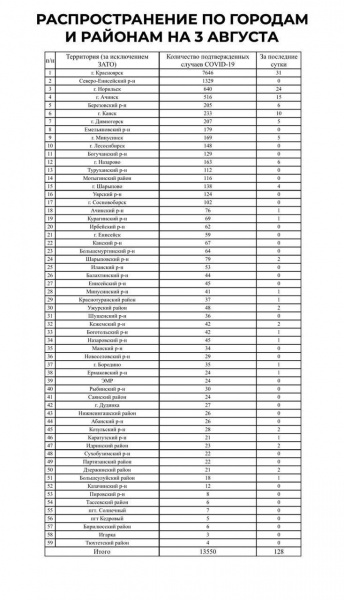 Роспотребнадзор Красноярского края и оперштаб публикуют данные за минувшие сутки, 2 августа, о числе выявленных случаев коронавируса в регионе. По данным ведомств, зафиксировано 128 новых. Всего в крае насчитывают за все время пандемии 13 550 больных.