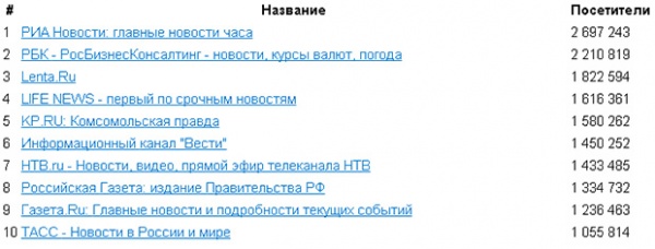 Далее по рейтингу самых посещаемых следуют «Лента.ру», сайты Lifenews и «Комсомольской правды».