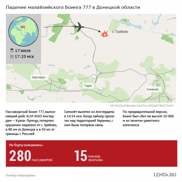 Информация о падении лайнера авиакомпании Malaysia Airlines на территории Донецкой области поступила около 19:00 по московскому времени. По имеющимся данным, в результате катастрофы погибли все 298 человек, находившихся на борту.