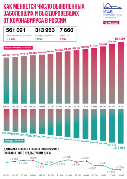 Всего на сегодняшний день зарегистрировано зарегистрировано 561 091 случай(+1,4%) коронавирусной инфекции в 85 регионах. За весь период зафиксировано 7 660 летальных исхода, выздоровели 313 963 человека.