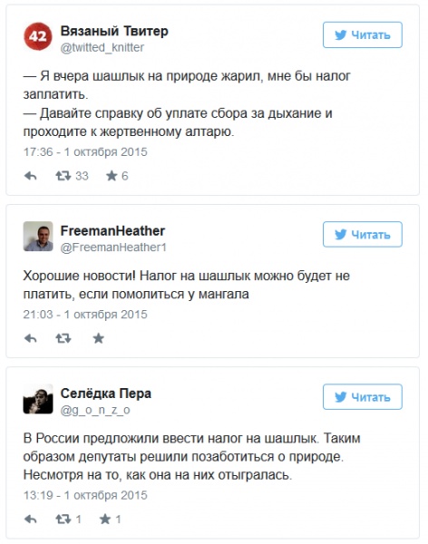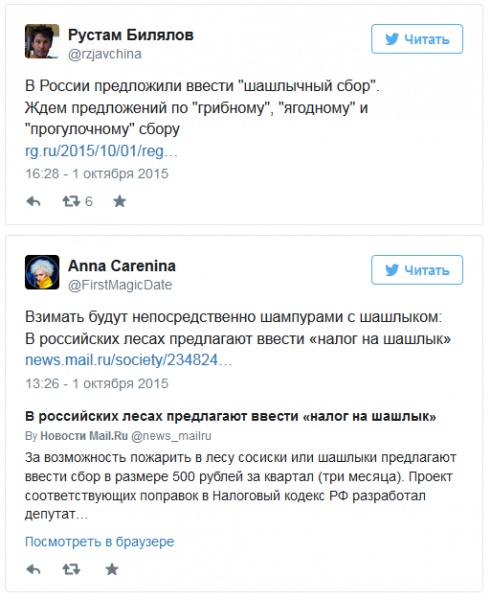 Депутат заксобрания Ленинградской области Владимир Петров предложил ввести налог на шашлык. Парламентарий хочет обязать граждан платить 500 рублей раз в квартал за возможность развести костер и установить мангал. Люди, которые придут на природу, чтобы собрать лекарственные травы, заготовить древесину, поохотиться или помолиться, платить налог не будут. Предполагается, что «лесной сбор» позволит сократить расходы муниципалитетов на уборку территории от оставленного отдыхающими мусора.