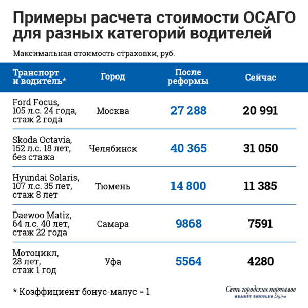 Ещё сложнее с территориальным коэффициентом, который зависит от места прописки автовладельца. Ряд городов попал в список неблагополучных, и для них установили непропорциональный коэффициент. Например, для Челябинска и Мурманска он составляет 2,1 единицы — больше, чем в других мегаполисах, включая Москву и Санкт-Петербург. Отмена территориального коэффициента выгодна «дорогим» городам, но может ударить по жителям мелких населённых пунктов, где сейчас ОСАГО дешевле.